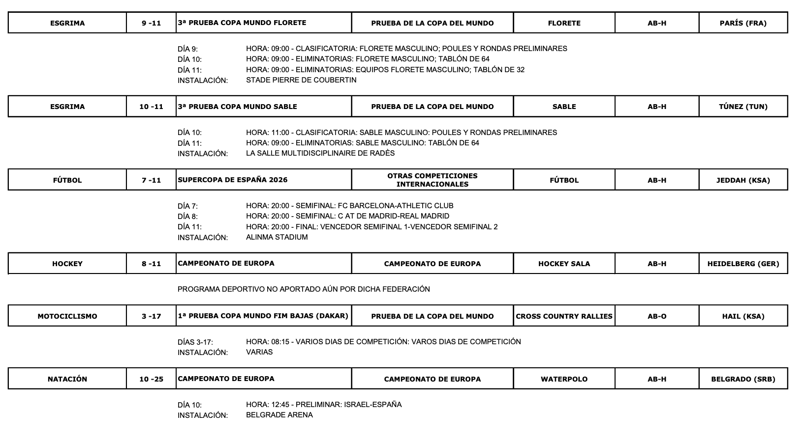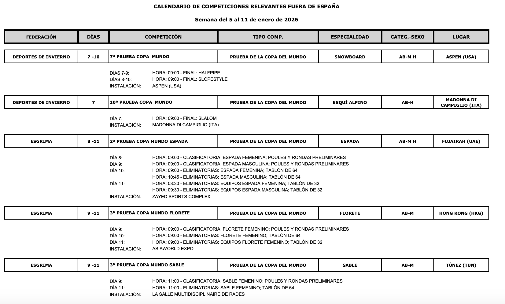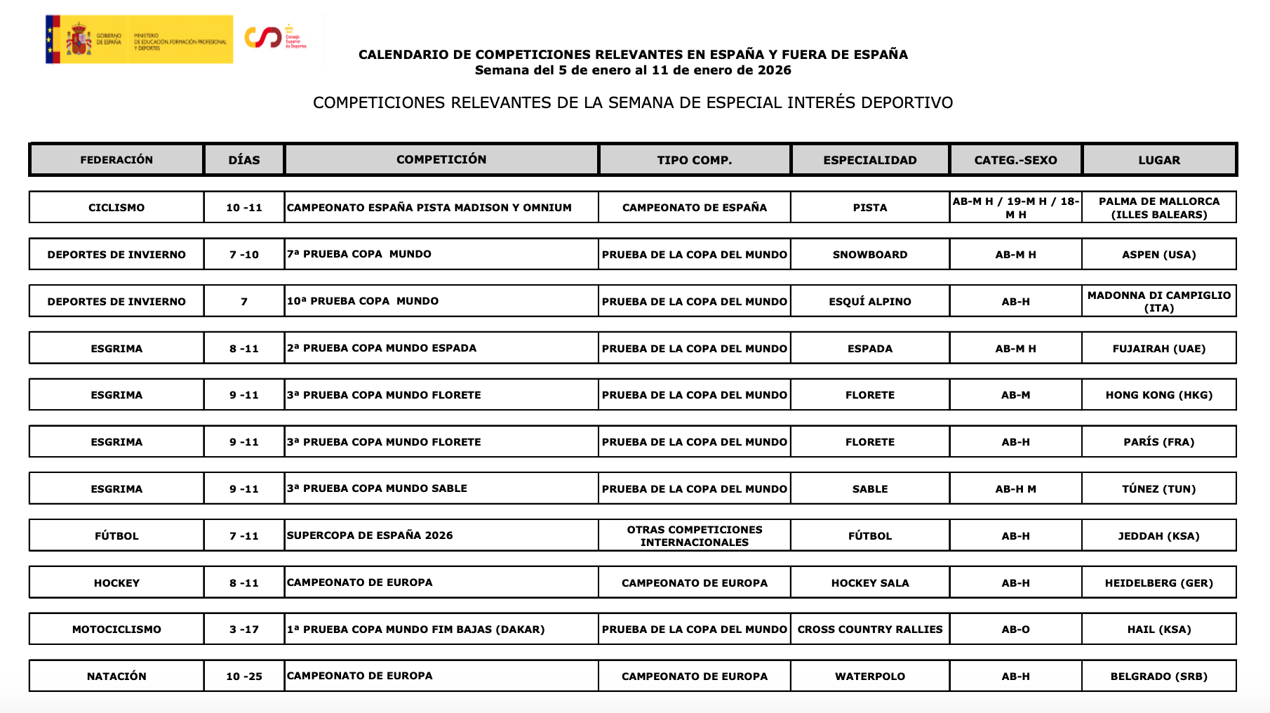 Kirol Ekitaldien Egutegiak modalitatearen, espezialitatearen, ekitaldiaren deskribapenaren, tokiaren eta herrialdearen arabera bilatzeko, egin klik esteka honetan: