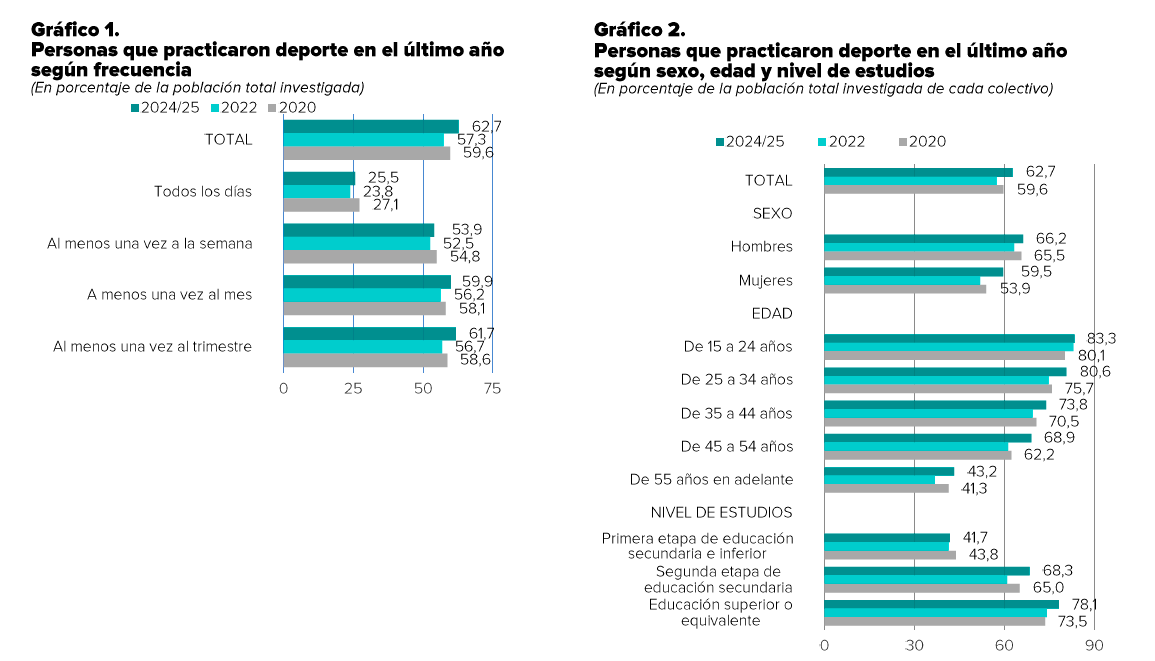 Zehazki, Espainiako herritarren % 62,7k kirola egin du azken urtean, aldizka, noizean behin edo bietan. Zifra horrek esan nahi du 2022an (aztertutako azken urtea) baino ehuneko 5,4 puntu handiagoa dela.